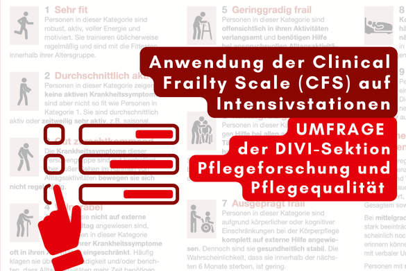 Die Sektion Pflegeforschung und Pflegequalität möchte herausfinden, wie häufig und in welchem Kontext die Clinical Frailty Scale (CFS) auf Intensivstationen im DACH-Bereich (Deutschland, Österreich, Schweiz) angewendet wird und bittet um Beteiligung an einer aktuellen Umfrage. Das Ergebnis wird später in einer Publikation der DIVI veröffentlicht.