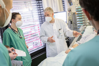 Das an zahlreichen größeren Kliniken inzwischen vorhandene Expertenwissen bei der intensivmedizinischen Versorgung von COVID-19-Patienten, soll dank digitaler Kooperationen künftig stärker von allgemeinen Krankenhäusern genutzt werden können. Um das Expertenwissen in der Breite verfügbar zu machen, hat der Gemeinsame Bundesausschuss (G-BA) gestern die Voraussetzung für die Finanzierung telemedizinischer Beratungen bei der Versorgung von Corona-Kranken beschlossen. Bis zum Jahresende erweiterte er die sogenannten Zentrums-Zuschläge auch auf Konsiliarleistungen von Spezialkliniken, die in einem intensivmedizinischen digital-gestützten Versorgungsnetzwerk (IDV-Zentren) eingebunden sind und bestimmte Qualitätsanforderungen erfüllen. „Dies ist wirklich ein großer Erfolg für die Intensivmedizin“, freut sich DIVI-Präsident Prof. Gernot Marx (im Foto in der Mitte). „Die Politik hat mit Blick auf die Entwicklung der Mutationen und Patientensicherheit schnell und vorausschauend agiert. Einen Zentrums-Beschluss in so kurzer Zeit hat es bisher in Deutschland noch nicht gegeben!“