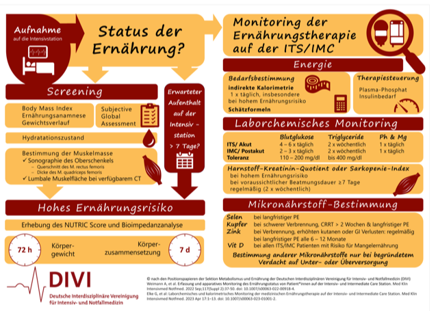 Positionspapier der Sektion Metabolismus und Ernährung der Deutschen Interdisziplinären Vereinigung für Intensiv- und NoHallmedizin (DIVI). Weimann A, Hartl WH, Adolph M, Angstwurm M, Brunkhorst FM, Edel A, de Heer G, Felbinger TW, Goeters C, Hill A, Kreymann KG, Mayer K, Ockenga J, Petros S, Rümelin A, Schaller SJ, Schneider A, Stoppe C, Elke G. Med Klin Intensivmed Notfmed. 2022 Sep;117(Suppl 2):37-50. doi: 10.1007/s00063-022-00918-4. Epub 2022 Apr 28.