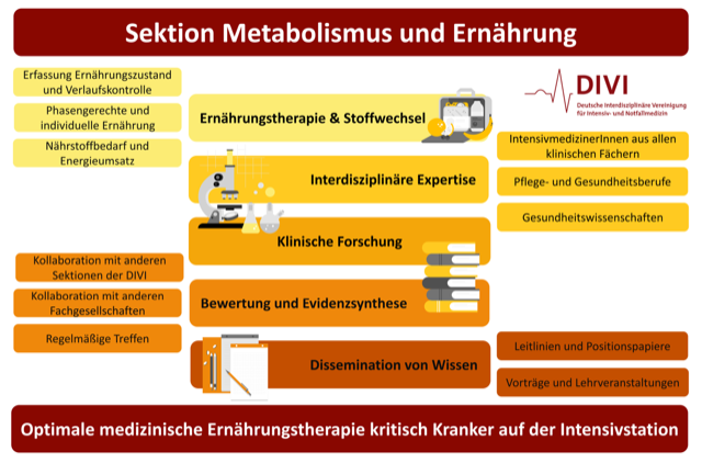 Ziel unserer Sektion ist - im Sinne der DIVI-Mission 2030 - Kompetenz und Qualität in der klinischen Durchführung der medizinischen Ernährungstherapie auf deutschen Intensivstationen weiterzuentwickeln und zu verbessern.